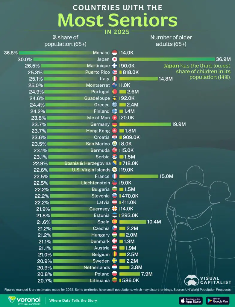 Infografika koju je objavio Visual Capitalist, zasnovana na podacima UN World Population Prospects za 2025. godinu, pruža sumornu, ali neophodnu sliku demografske budućnosti svijeta. Među zemljama sa najvišim procentom starijeg stanovništva (65+), Bosna i Hercegovina i njeni susjedi zauzimaju zabrinjavajuće visoke pozicije. Ovi podaci nisu samo statistika; oni su najava dubokih ekonomskih i socijalnih izazova koji nas očekuju.