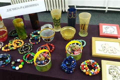 Izloženi su ručno napravljeni nakit, crteži na staklu i dekupaž.
