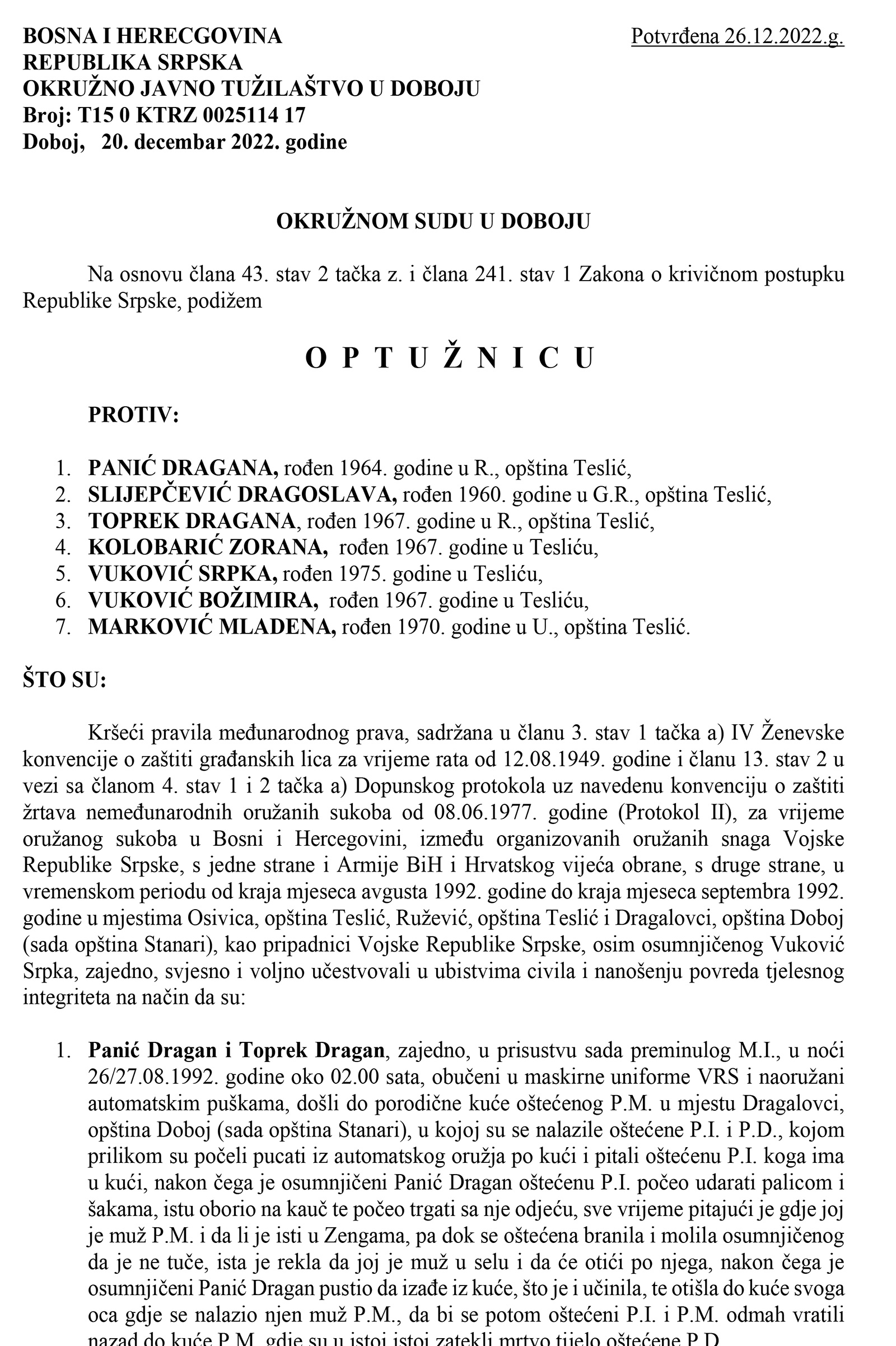 Optužnicu je potvrdio sudija za prethodno saslušanje Okružnog suda u Doboju, dana 26.12.2022.godine.