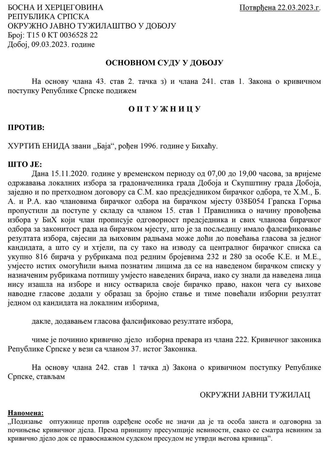Okružno javno tužilaštvo u Doboju, nakon sprovedene istrage, dana 09.03.2023.godine podiglo je optužnicu protiv Hurtić Enida, zbog krivičnog djela Izborna prevara.