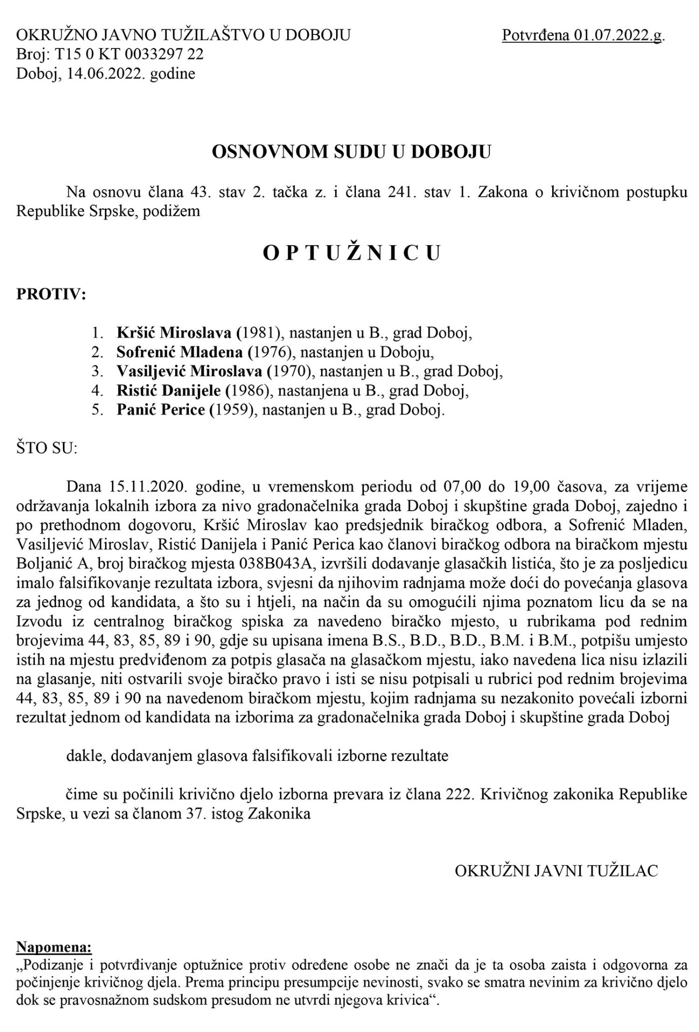 Okružno javno tužilaštvo u Doboju, nakon sprovedene istrage, podiglo je optužnicu protiv Kršić Miroslava, Sofrenić Mladena, Vasiljević Miroslava, Ristić Danijele i Panić Perice, zbog krivičnog djela Izborna prevara.