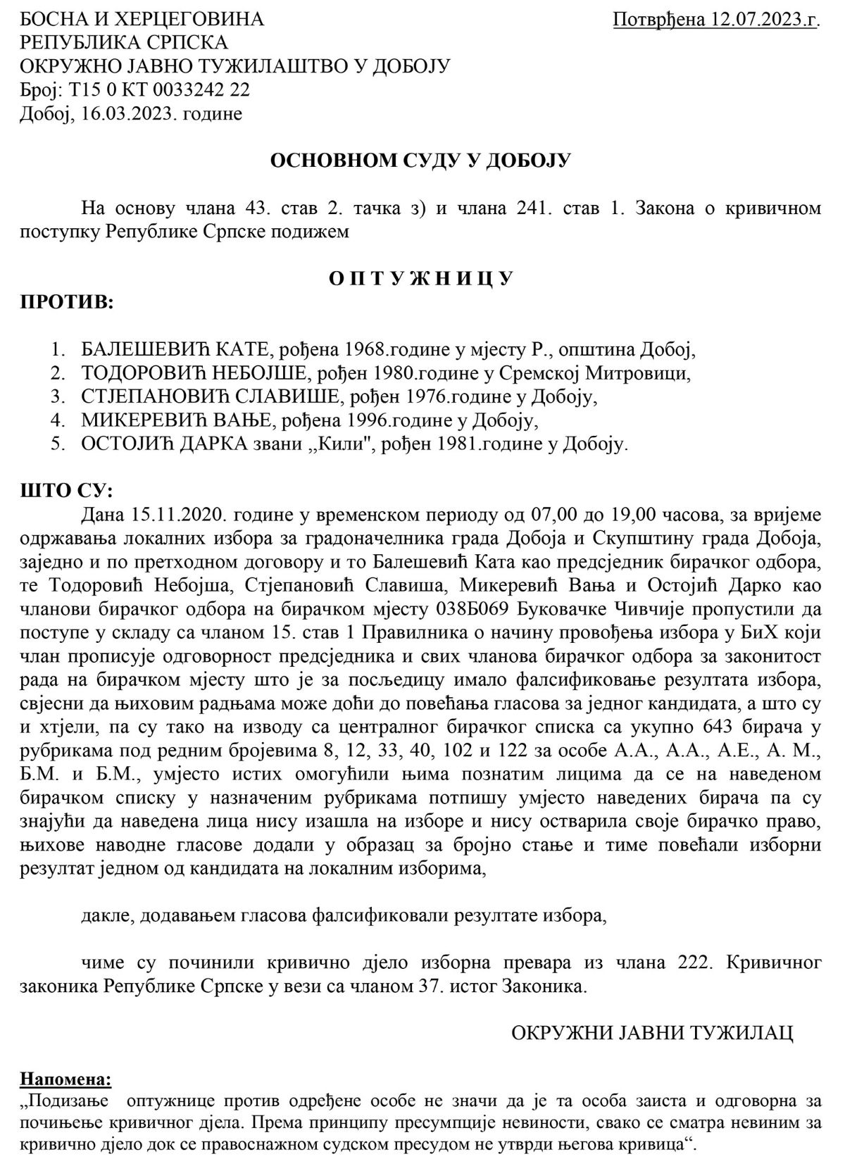 Okružno javno tužilaštvo u Doboju, nakon sprovedene istrage, dana 16.03.2023.godine podiglo je optužnicu protiv Balešević Kate, Todorović Nebojše, Stjepanović Slaviše, Mikerević Vanje i Ostojić Darka, zbog krivičnog djela Izborna prevara.
