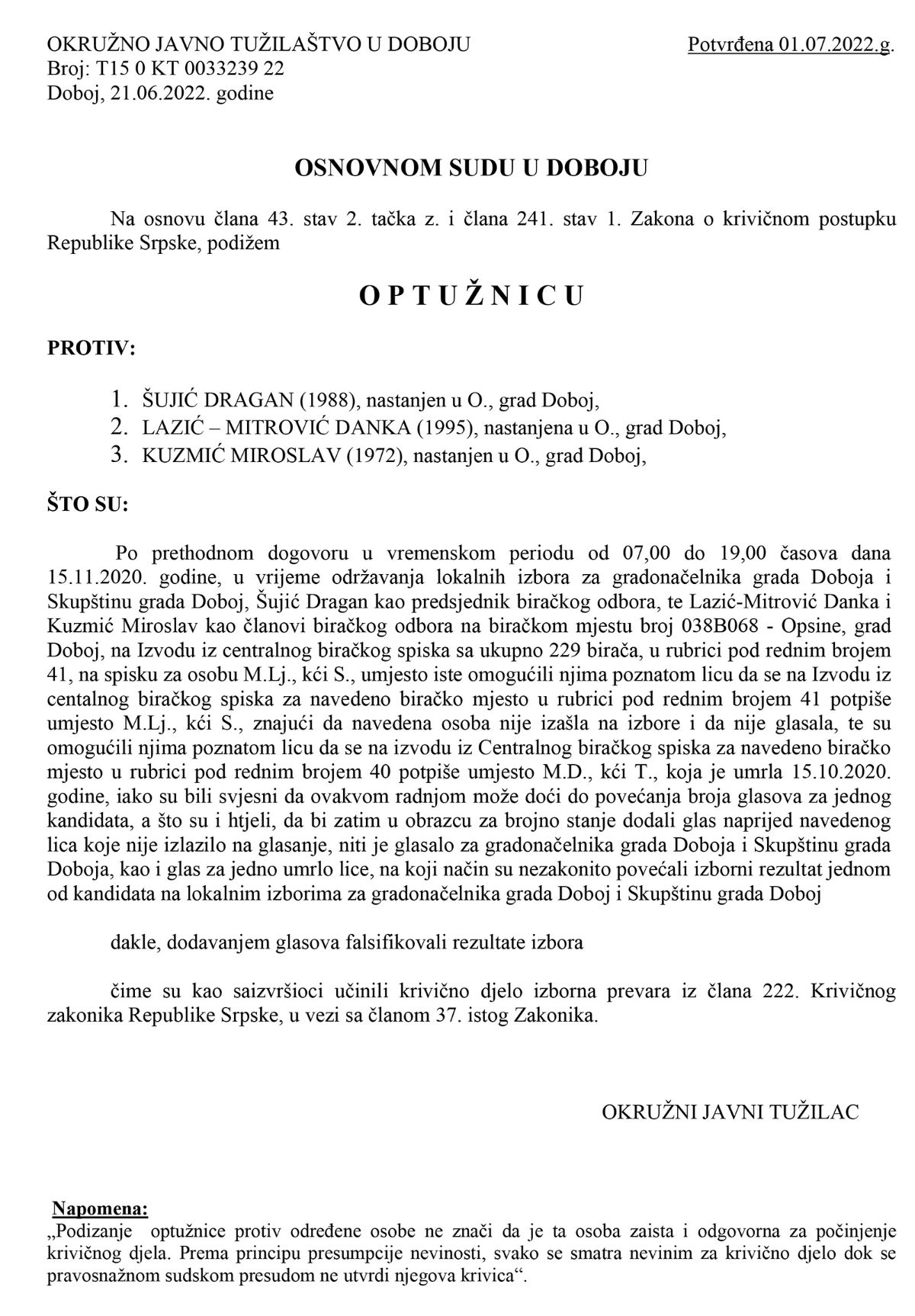 Okružno javno tužilaštvo u Doboju, nakon sprovedene istrage, podiglo je optužnicu protiv Šujić Dragana, Lazić-Mitrović Danke i Kuzmić Miroslava, zbog krivičnog djela Izborna prevara.