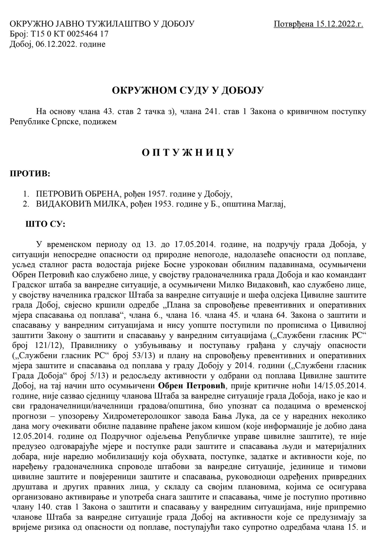 Okružno javno tužilaštvo u Doboju, nakon sprovedene istrage, dana 06.12.2022.godine podiglo je optužnicu protiv Petrović Obrena i Vidaković Milka, zbog krivičnog djela Izazivanje opšte opasnosti.