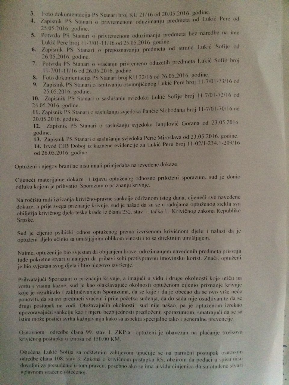Nakon izricanja presude od Lukića su oduzeta i klešta i gvožđe koje je koristio prilikom obijanja pomoćnog objekta od Sofije I. Prilikom razmatranja sporazuma o priznanju krivice Lukić je izjavio da je krivicu priznao dobrovoljno i svesno i da se odrekao prava na suđenja.