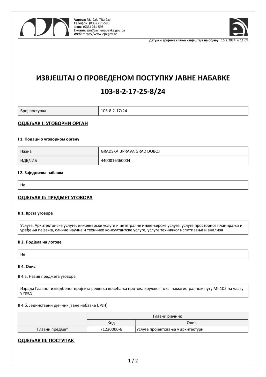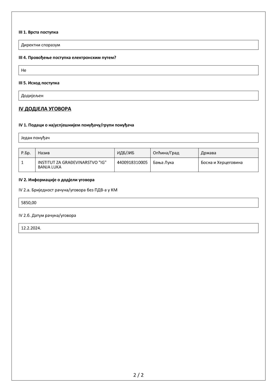 Nedavno objavljen izveštaj o javnoj nabavci ukazuje na to da je "Institut za građevinu 'IG' Banja Luka" bio jedini ponuđač za izradu Glavnog izvođačkog projekta za povećanje protoka kružnog toka na magistralnom putu MI-105 na ulazu u grad, sa ugovorom vrednim 5.850 KM bez PDV-a, potpisanog 12. februara 2024. godine.