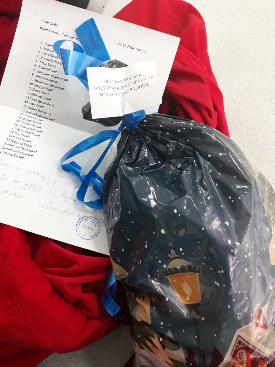 Savjet učenika Saobraćajne i elektro škole Doboj organizovao je svečanu priredbu sa Deda Mrazom i paketićima za djecu "Kutka" U tradicionalnoj akciji "Jedan slatkiš, jedno dijete" od 10 do 21.decembra ove godine prikupljali su slatkiše za paketiće.