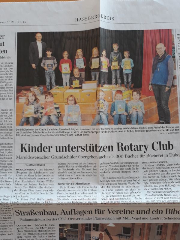 "Naši prijatelji iz Hassfurta su ove godine zajedno sa školama i vrtićima proveli akciju u kojoj su prikupljene knjige, slikovnice i namještaj. Cijelu akciju od prikupljanja, skladištenja pa i utovara radili su naši prijatelji u Hassfurtu tako da smo i mi zasukali rukave i pomogli kod istovara. Saradnja naša dva kluba u Doboj je donijele vrijedne projekte. Podsjetiću na nabavku opreme i izgradnju nastrešnice za Fondaciju Dnevni centar za djecu i omladinu sa smetnjama u razvoju, kupovinu savremenog i kompletno opremljenog vozila hitne pomoći za dobojsku bolnicu i mobilnog inkubatora, zatim donacije odjeće za Crveni krst u drugim opštinama naše regije, grnčarskog kola za Udruženje "Sunce" u Derventi, novogodišnjih paketića uručenih neki dan pa evo i do ove sada urađene. Moto rotarija je "služenje i druženje", i zaista svi se trudimo da naše vrijeme a i sredstva koja prikupimo služe za unaprjeđenje naše zajednice. Druženje naša dva kluba smo potvrdili kroz dvije naše posjete njima i četiri njihova dolaska u Doboj.", izjavio je Saša Vidić, predsjednik Rotary kluba Doboj.