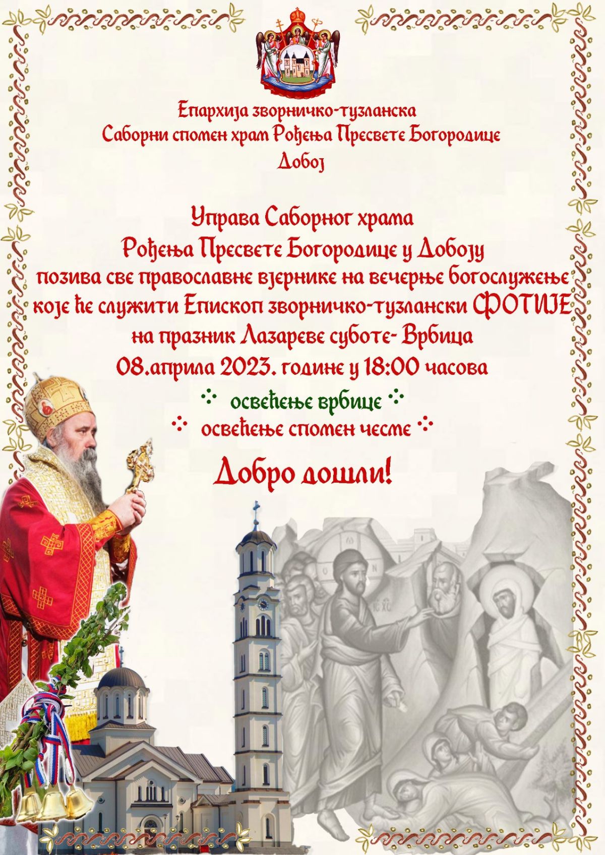 U Sabornom spomen hramu Rođenja Presvete Bogorodice u Doboju, sve je spremno za svečano večernje bogosluženje koje će se održati na praznik Lazareve subote - Vrbica 08. aprila 2023. godine u 18 časova. Uprava hrama poziva sve pravoslavne vjernike da se pridruže i zajedno proslave ovaj važan dan u pravoslavnom kalendaru.