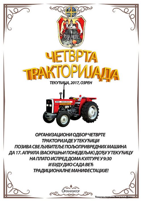 Organizacioni odbor četvrte Traktorijade u Tekućici poziva sve ljubitelje poljoprivrednih mašina da 17.aprila (Vaskršnji ponedeljak) dođu u Tekućicu, na plato ispred Doma kulture u 9,30 časova i budu dio sada već tradicionalne manifestacije!