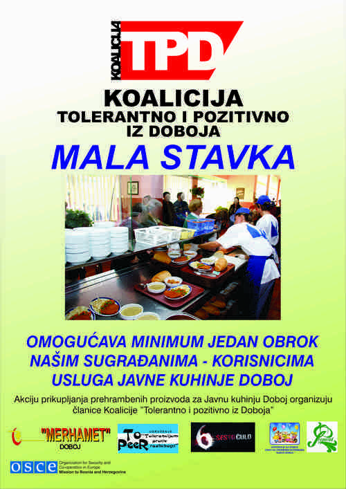 Koalicija „Tolerantno i pozitivno iz Doboja“ nastavlja sa svojim aktivnostima u cilju promocije tolerancije i socijalne kohezije. Ovaj put organizuje humanitarnu akciju u saradnji sa trgovačkim centrima: KONZUM, BINGO, BELAMIONIX, ĐURIĆ (market na Zelenoj pijaci) i KOŠUTA i podršku OSCE Misija u BiH.