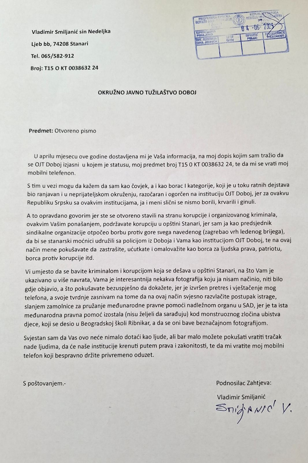 U pismu Smiljanić podsjeća da je u aprilu mjesecu tražio informaciju o statusu predmeta T15 0 KT 0038632 24, koji se odnosi na njegov privremeno oduzeti mobilni telefon. Umjesto odgovora, kaže da je dobio razočaravajući tretman institucije u koju je, kao borac Republike Srpske, imao povjerenje.
