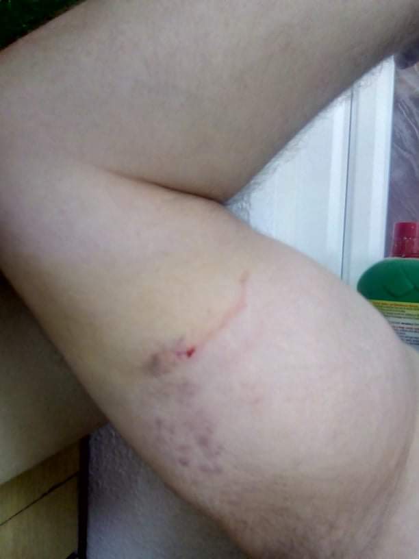 Prilikom činjenja pomenutog djela nanose mi povrede u vidu krvnog podliva i oguljotine desne nadlaktice, te sam osjetio jake bolove u lumbalnom djelu kičme. Obzirom da se nisam osjećao dobro pozivam hitnu pomoć te obavještavam pripadnike policijske stanice.