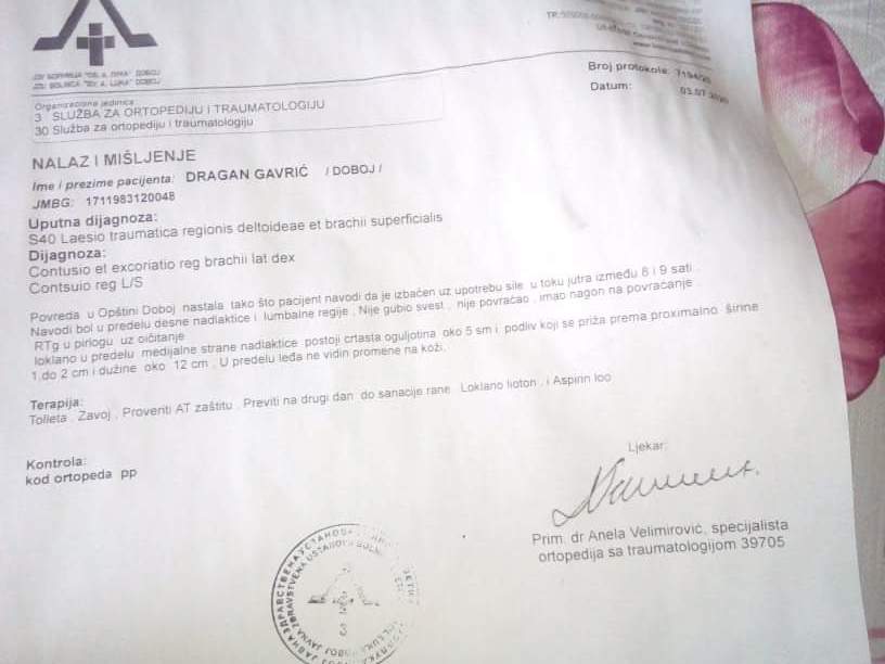 Izlaskom službe hitne pomoći ustanovili su da sam usred posljedica stresne situacije zadobio povišen krvni pritisak 180/110, te me prevoze na pregled u prostorije hitne pomoći. Nakon pregleda dežurnog ljekara isti me radi saniranja povreda te daljih pretraga upućuje u bolnicu na odeljenje hirurgije gdje mi čiste postojeću ranu te me dalje upućuju u službu za ortopediju. Nakon rtg snimanja ljekar konstatuje nagnječenja nadlaktice desne ruke i povrede karakterise kao "trenutno lake telesne povrede".