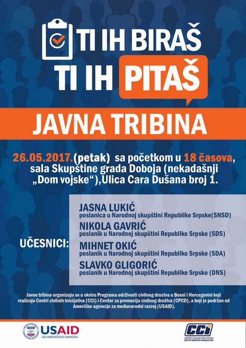 Centri Civilnih Inicijativa (CCI), 26.05.2017. godine (petak) u Doboju organizuju Javnu tribinu „TI IH BIRAŠ-TI IH PITAŠ“ s početkom u 18 časova, u Sali za sjednice Skupštine grada Doboja (Stari Dom Vojske), u Ulici Cara Dušana broj 1.