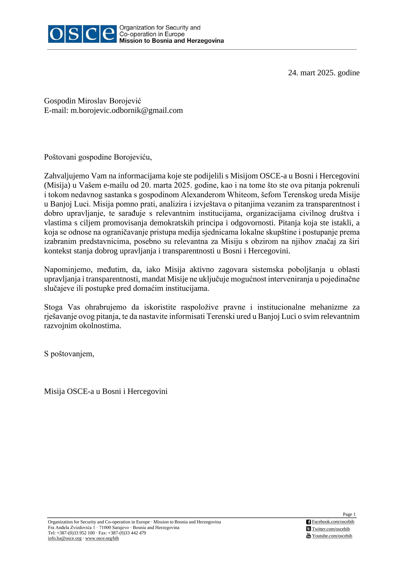 Zbog svega navedenog, odbornik Borojević se, očekivano, obratio Misiji OSCE-a u Bosni i Hercegovini – organizaciji koja već decenijama tvrdi da promoviše demokratiju, transparentnost i odgovorno upravljanje. U pismu i direktnom razgovoru sa predstavnikom Terenskog ureda u Banjoj Luci, iznio je konkretne navode o ograničavanju pristupa medijima i postupanju prema izabranim predstavnicima.