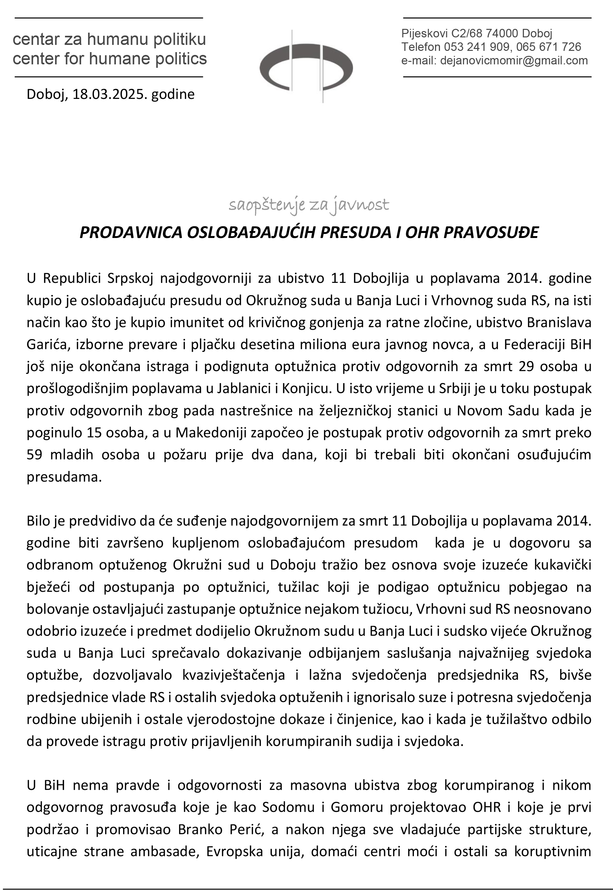 Prema saopštenju koje je potpisao predsjednik Centra, Momir Dejanović, odgovorni za smrt 11 osoba u poplavama u Doboju oslobođeni su na Okružnom sudu u Banjoj Luci i Vrhovnom sudu Republike Srpske. Dejanović u svom obraćanju iznosi tvrdnje da je pravosudni sistem u BiH podložan korupciji te da je donošenje oslobađajućih presuda rezultat sistemskih slabosti i političkih pritisaka.
