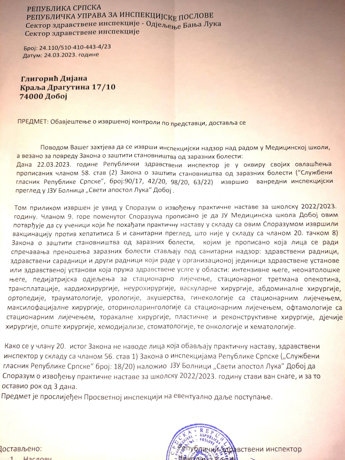 "Ovim putem želimo da obavijestimo javnost da je Zdravstvena inspekcija Republike Srpske izvršila inspekcijski nadzor u JZU Sveti apostol Luka i naložila u roku od tri (3) dana stavljanje nezakonitog Sporazuma van snage!