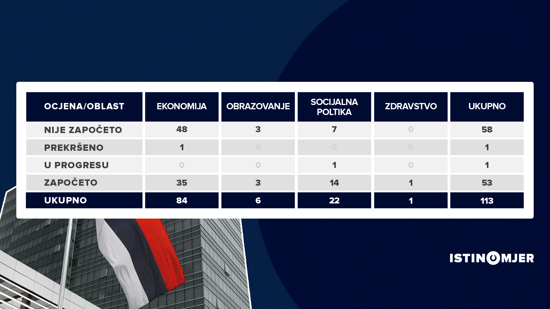 Najveći broj datih obećanja, njih 84, odnosi se na oblast ekonomije, 22 obećanja data su iz domena socijalne politike, šest obećanja odnosilo se na obrazovanje te samo jedno na zdravstvo.