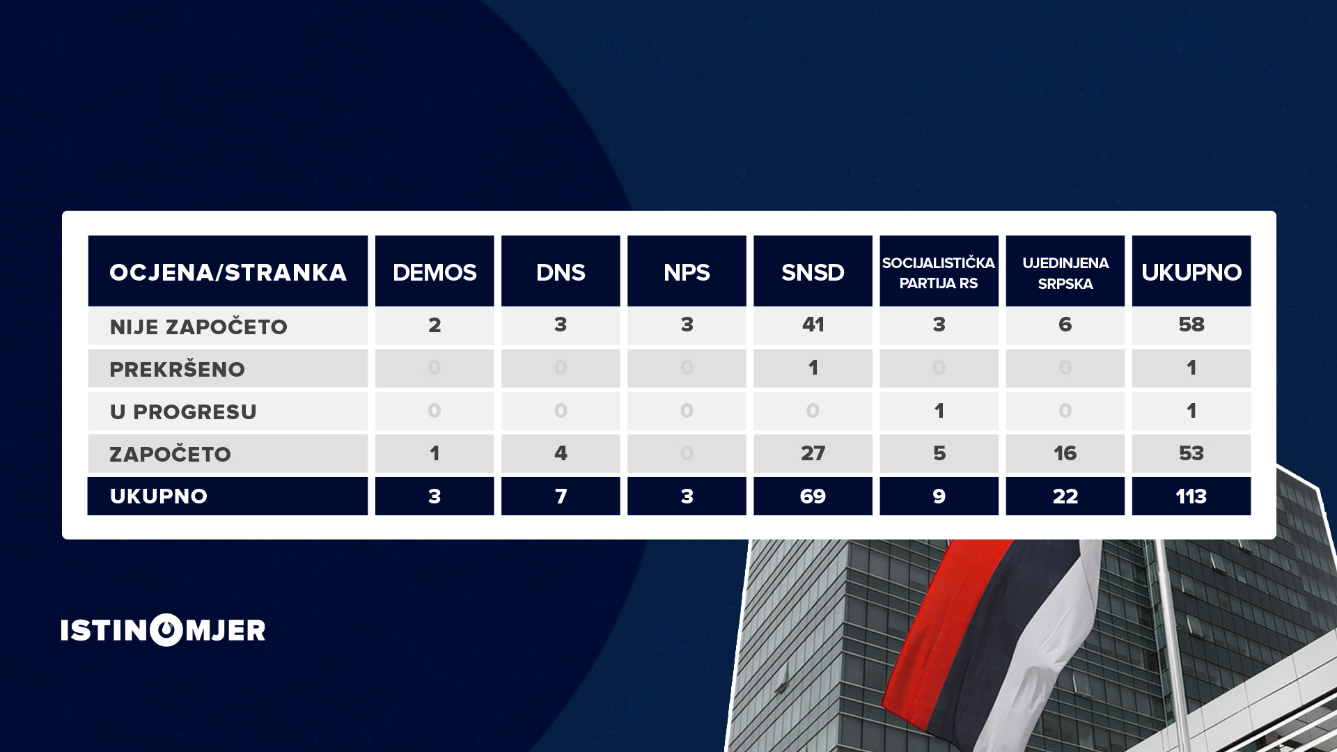 Vladu RS formiralo je 21. decembra 2022. godine šest političkih partija (SNSD, SPRS, DEMOS, DNS, NPS i Ujedinjena Srpska), a Istinomjer prati progres na ispunjavanju ukupno 113 obećanja ovih partija, od kojih je jedino Ujedinjena Srpska imala predizborni program, dok su ostala obećanja prikupljena sa zvaničnih internet-stranica, društvenih mreža političkih partija, kao i sa snimaka predizbornih skupova. Najviše obećanja (69) imao je SNSD, Ujedinjena Srpska imala je 22 obećanja, dok su ostale partije dale tek po nekoliko obećanja.