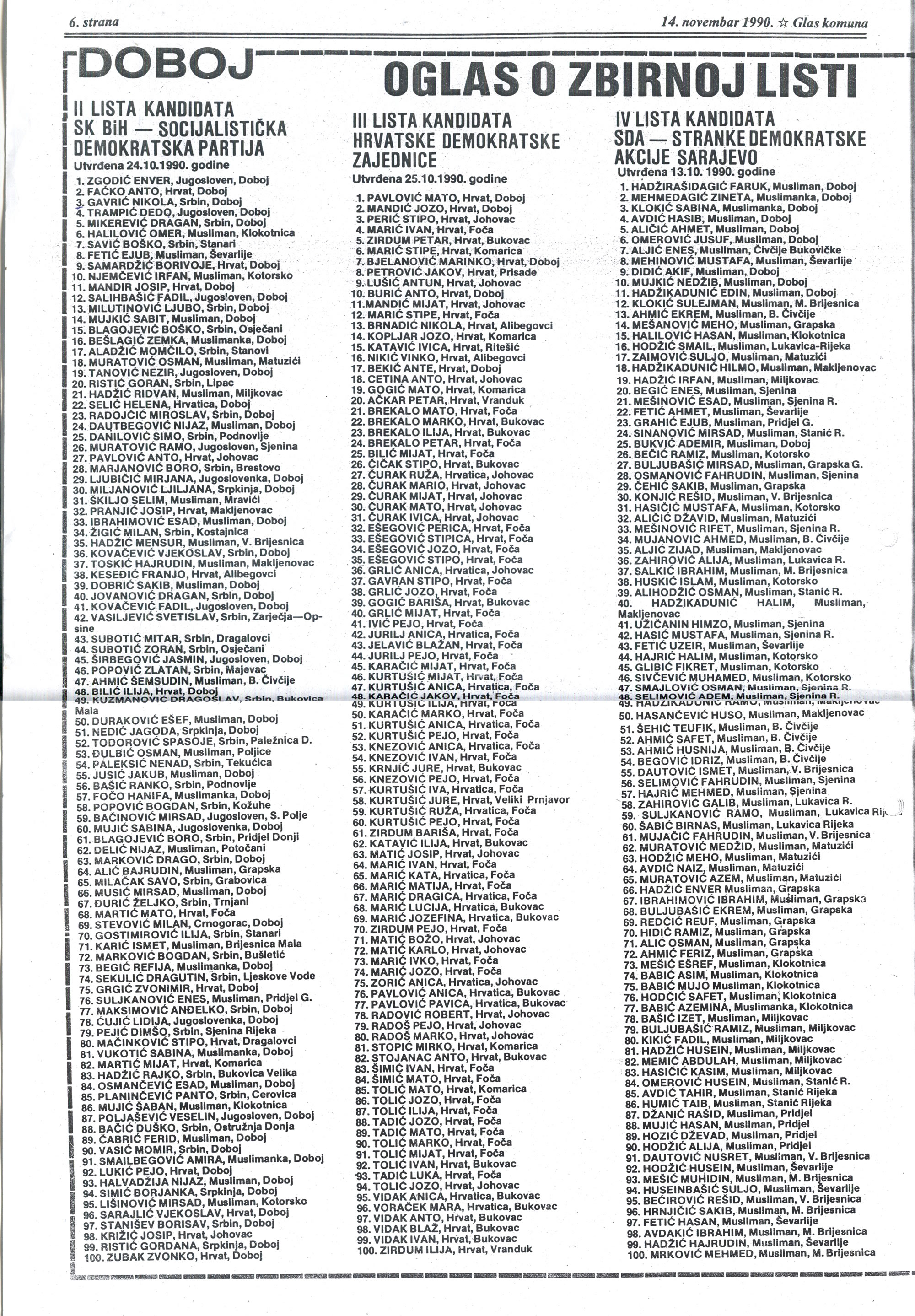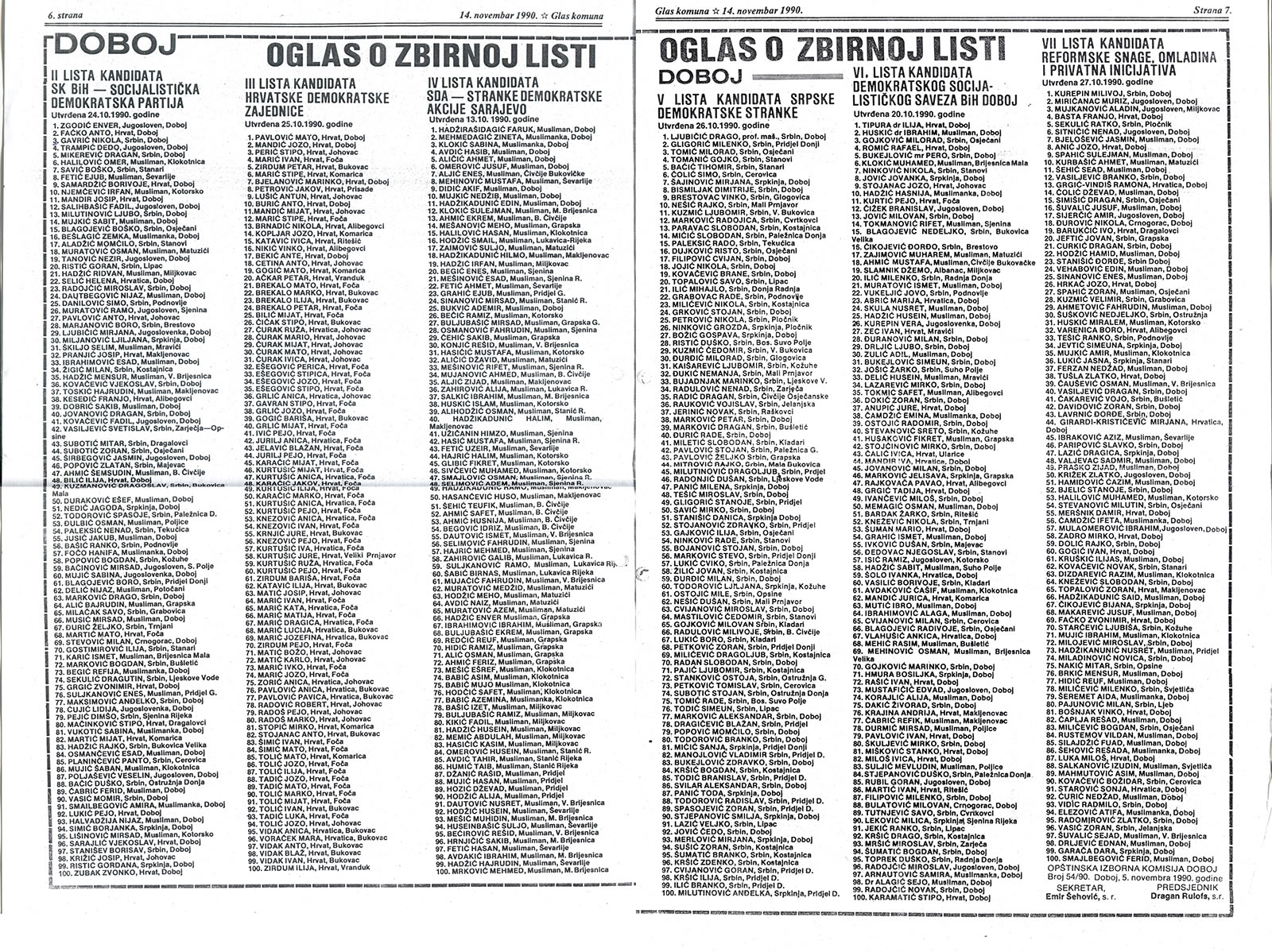 Da bismo malo razbili ovu monotoniju, pokucaćemo na vrata zaboravljenih asova prvih "demokratskih" izbora u gradu. "Glas komuna" u svom izdanju od 14. novembra 1990. objavio je oglas o zbirnoj listi kandidata i evo donosimo vam spisak najbitnijih. Ako pažljivo pročitate, primijetićete zanimljiva imena i partije.