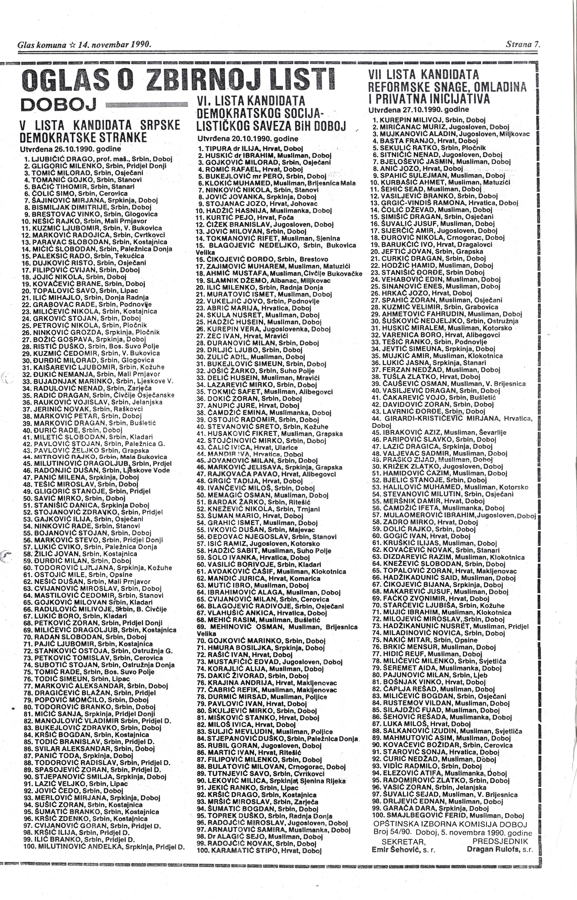 OPŠTINSKA IZBORNA KOMISIJA DOBOJ Broj 54/90. Doboj, 5. novembra 1990. godine
