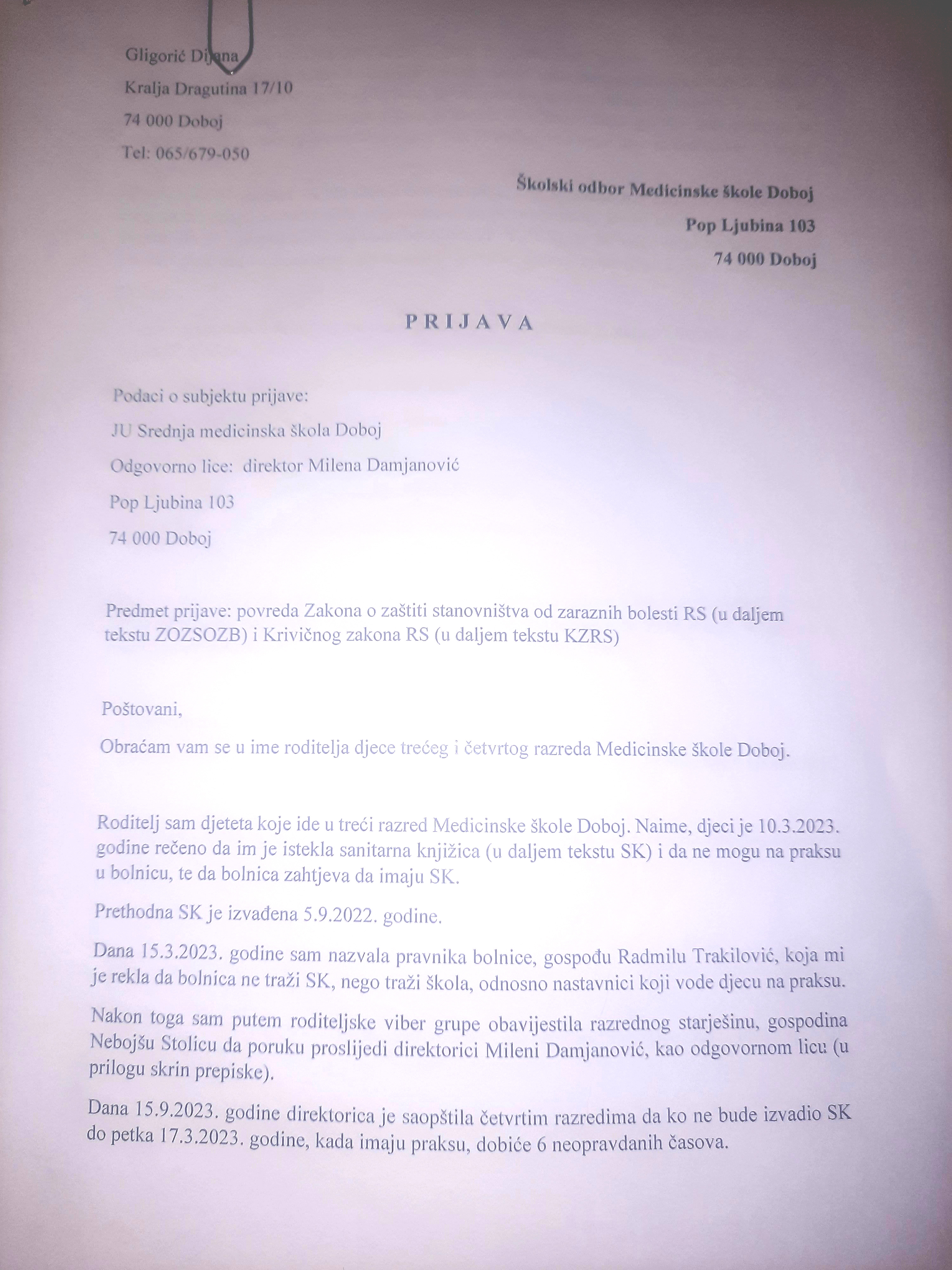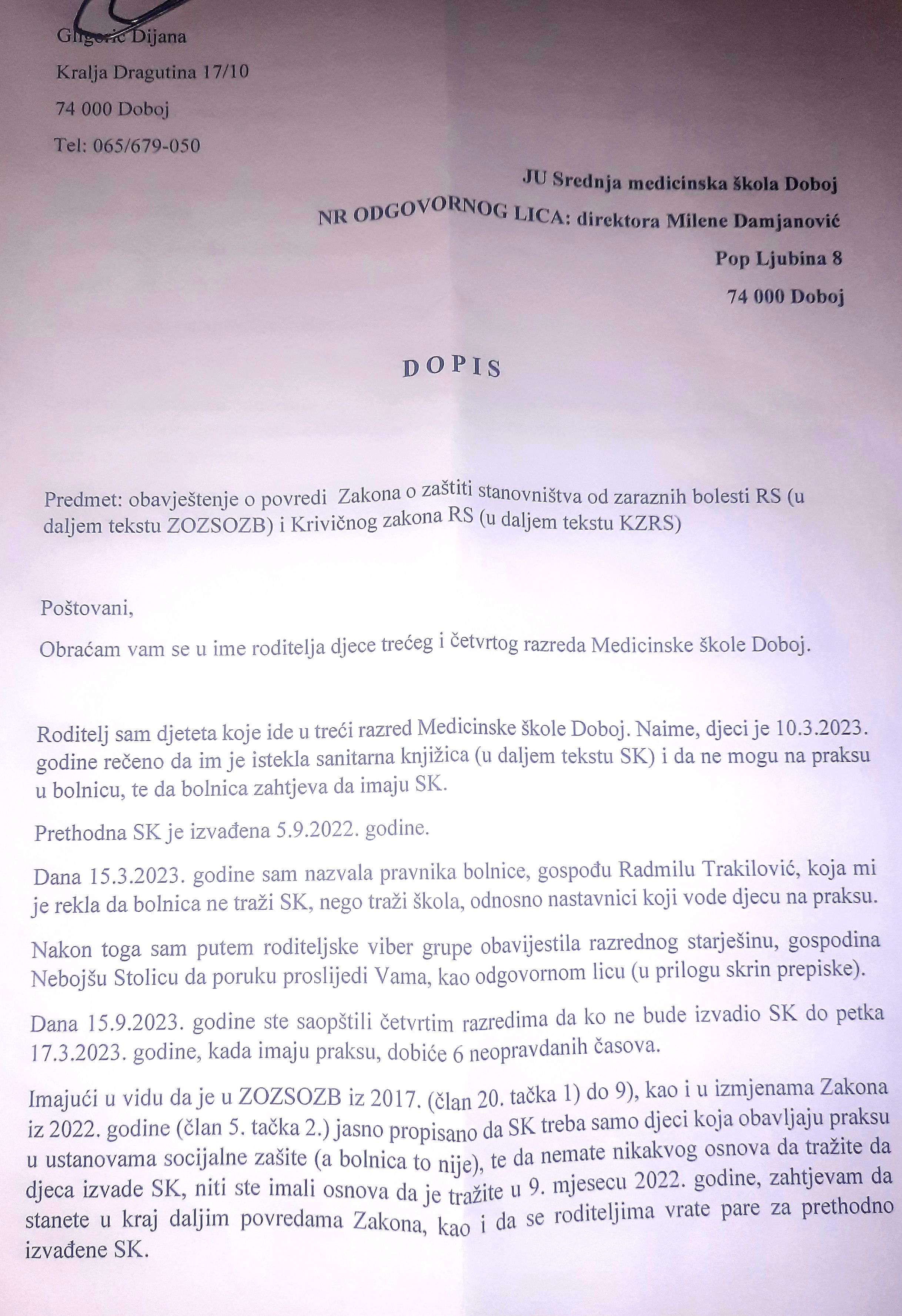 U redakciju gradskog nezavisnog informativnog portala Dobojski Info stigao je dopis roditelja učenika Medicinske škole u kome oni iznose optužbe na račun direktora škole, a po pitanju obaveze učenika da imaju sanitarne knjižice kako bi mogli pristupiti praksi u gradskoj bolnici.