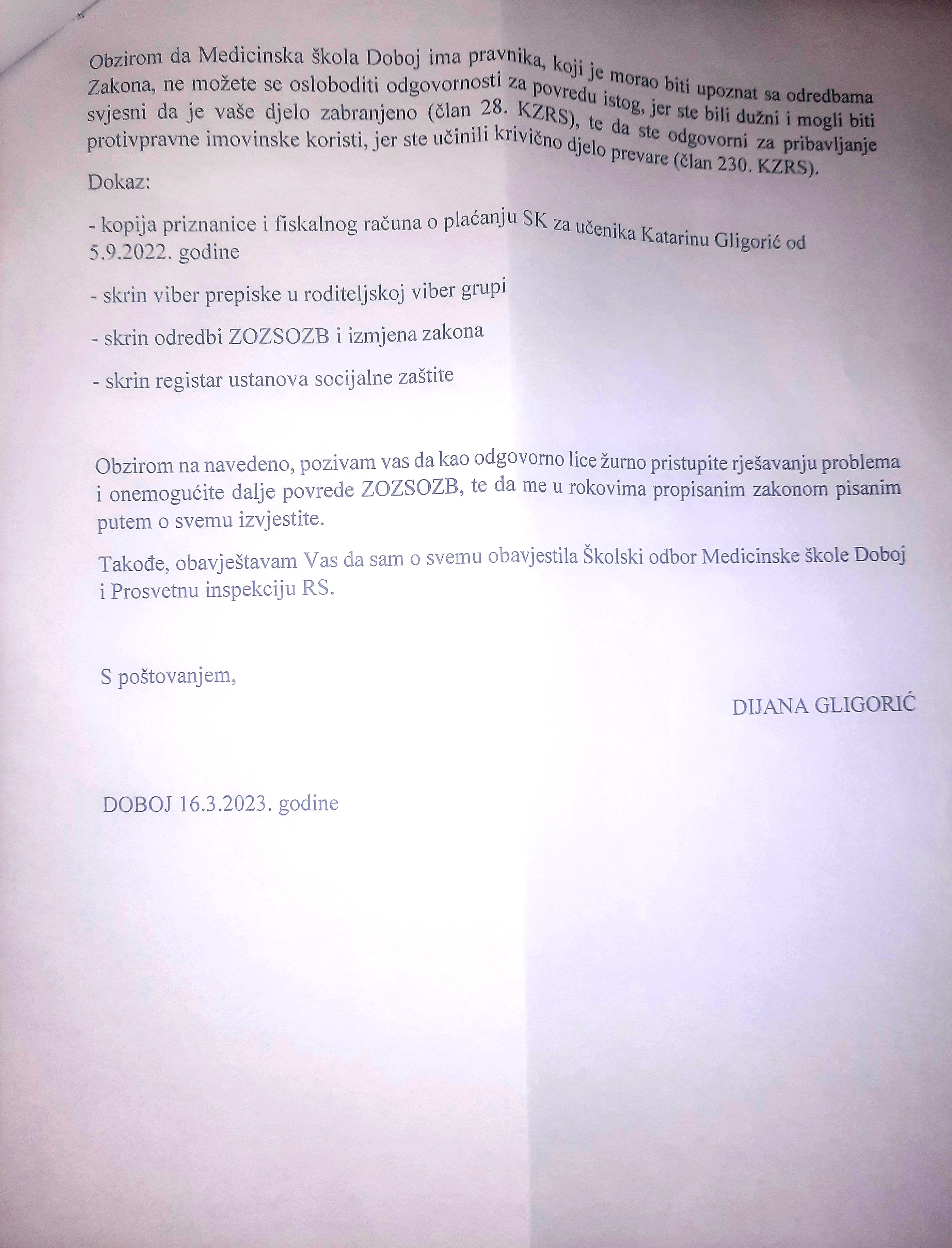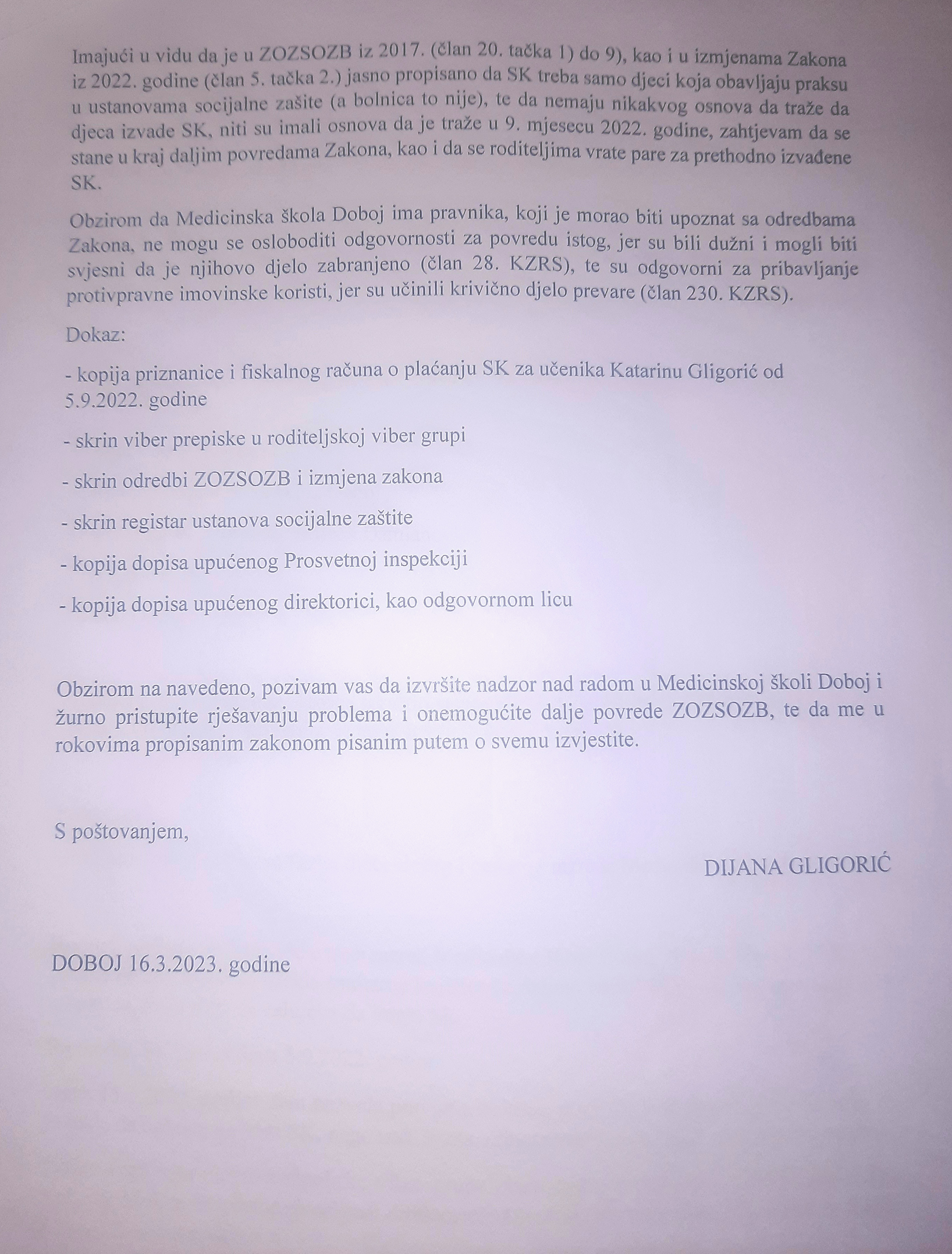 Sve ovo je proslijeđeno školskom odboru Medicinske škole i prosvjetnoj inspekciji RS od kojih tražimo da se po hitnom postupku izvrši nadzor nad ovim nezakonitim radnjama i sankcionišu odgovorna lica koja su pribavila protivpravnu korist."