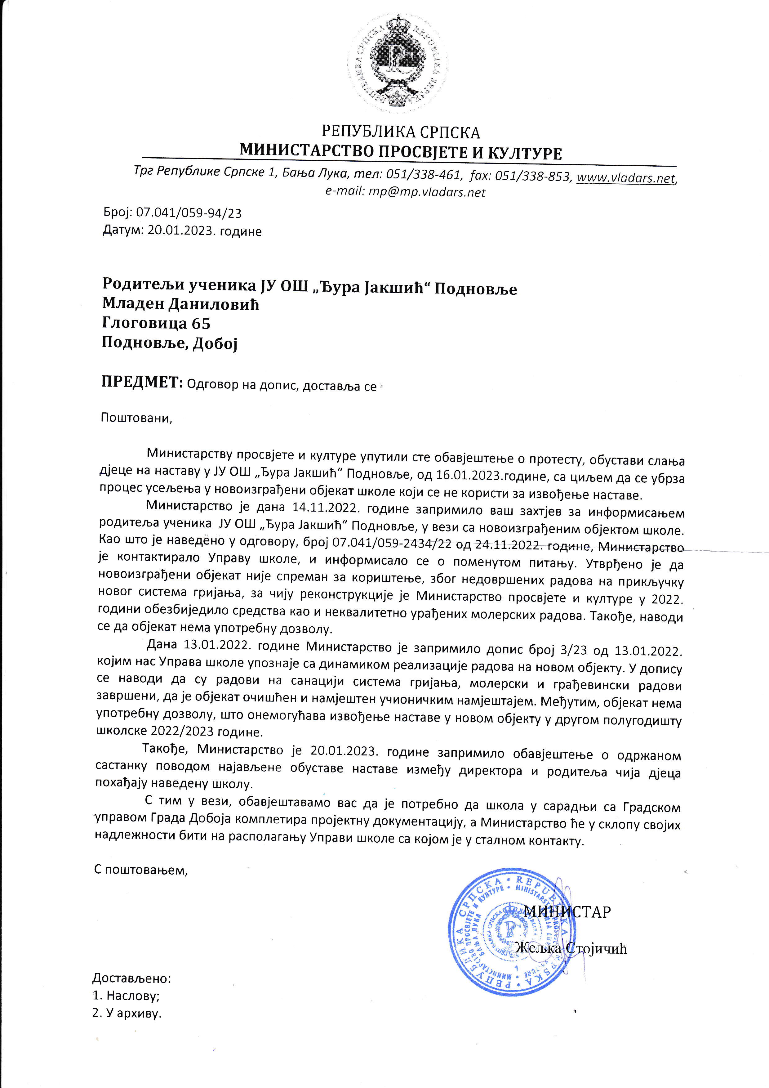 U nastavku prenosimo obraćanje udruženih roditelja OŠ "Đura Jakšić" Podnovlje medijima i upravi škole, mjesnoj zajednici, gradu Doboju - kancelariji gradonačelnika, Ministarstvu Prosvjete i kulture Republike Srpske, Američkoj ambasadi: