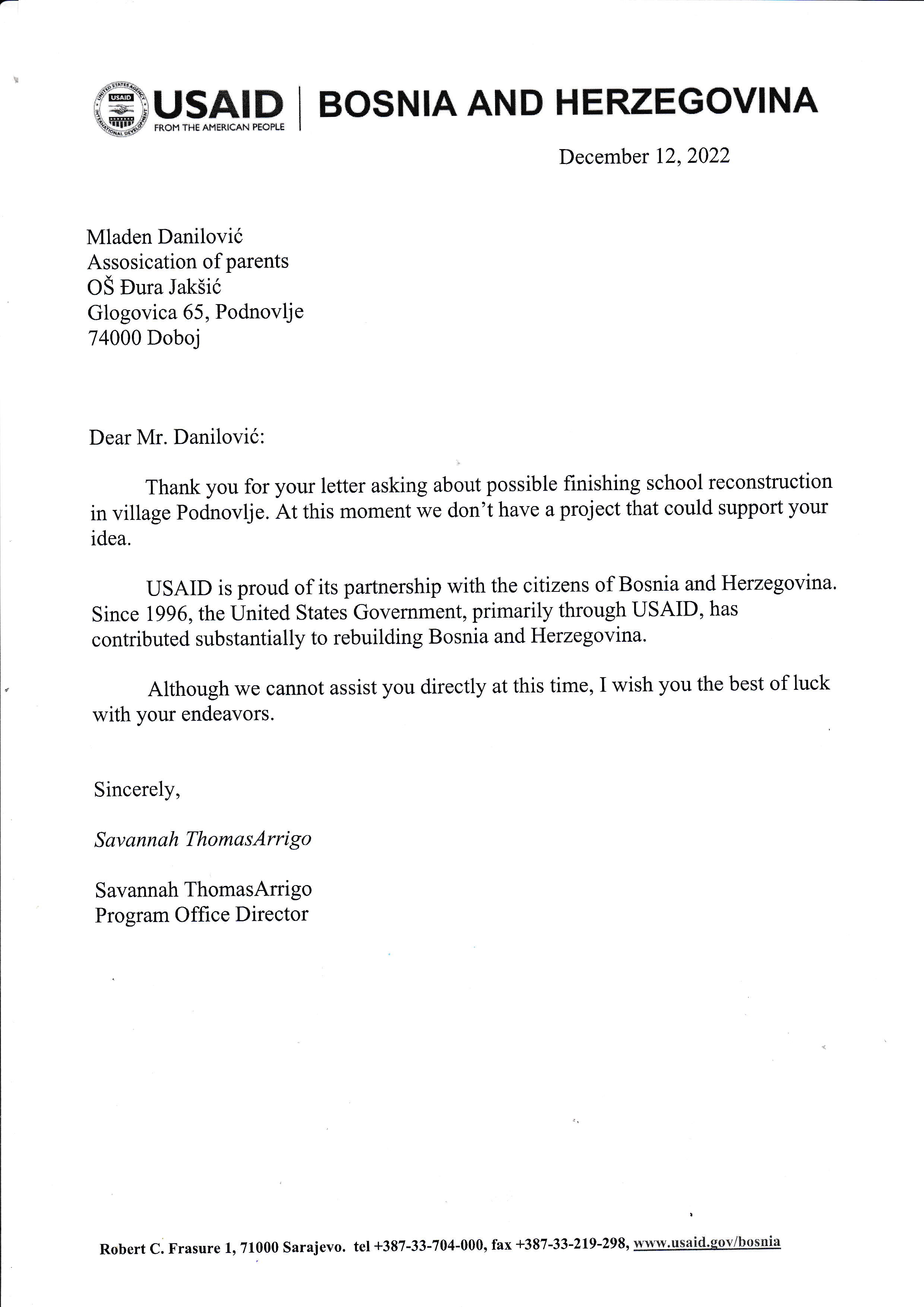 Obraćali smo se upravi škole, mjesnoj zajednici, gradu Doboju - kancelariji gradonačelnika, Ministarstvu Prosvjete i kulture Republike Srpske, Američkoj ambasadi. U prilogu dostavljamo Vam dokumenta i odgovore koje smo dobili.