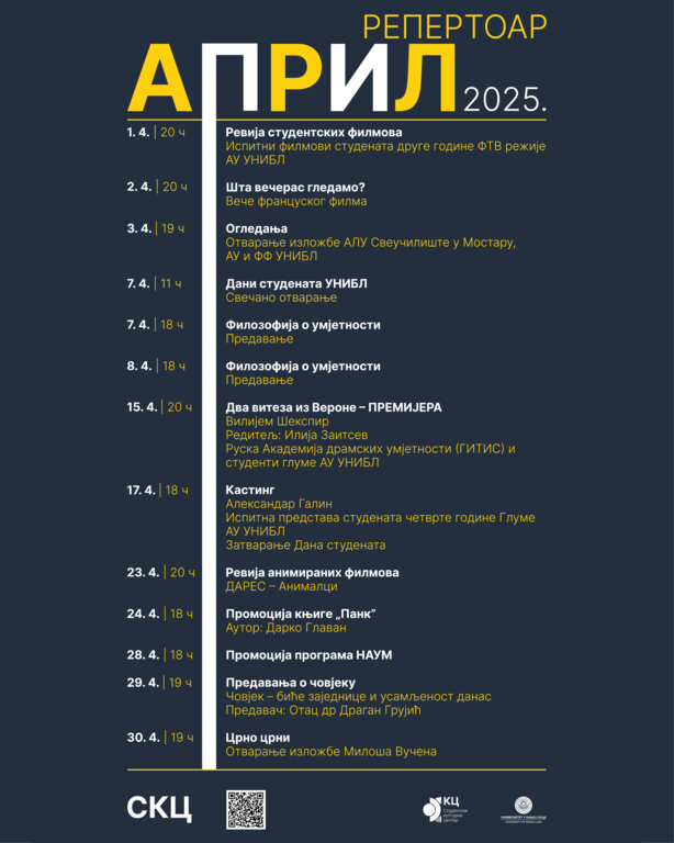 Studentski kulturni centar Univerziteta u Banjoj Luci (SKC UNIBL) predstavio je raznovrstan kulturni program za april, u kojem se smjenjuju filmske revije, izložbe, predavanja i pozorišne predstave. Ulaz na sve događaje je slobodan.