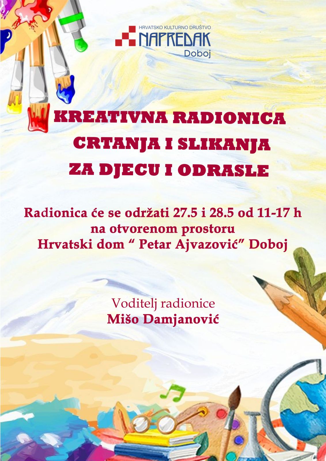 Hrvatsko kulturno društvo "Napredak" Doboj poziva sve zainteresirane da se pridruže ovoj likovnoj radionici i iskoriste priliku za stvaranje i izražavanje. Dođite 27. i 28. svibnja u Hrvatski dom "Petar Ajvazović" u Doboju, u 11 sati ujutro i budite dio ove umjetničke manifestacije.