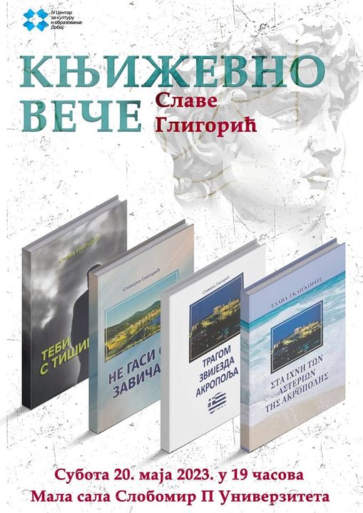 Slavojka – Slava Gligorić, rođena 1957. godine u Кrsnom Polju kod Maglaja, će predstaviti svoje stvaralaštvo. Nakon završene osnovne škole, Slavojka je diplomirala u Medicinskoj školi u Doboju, a kasnije je stekla diplomu na Višoj pedagoškoj akademiji u Beogradu. Njeno interesovanje za poeziju intenziviralo se tokom boravka u Grčkoj, kako tokom ratnog, tako i poratnog perioda. Do sada je objavila nekoliko knjiga, uključujući "Tebi s tišinom", "Ne gasi se zavičaju" i "Tragom zvijezda Akropolja". Takođe, objavljena je i knjiga njene poezije prevedene na grčki jezik. Slavojka je dobitnik više pohvala, nagrada i priznanja za svoj rad.