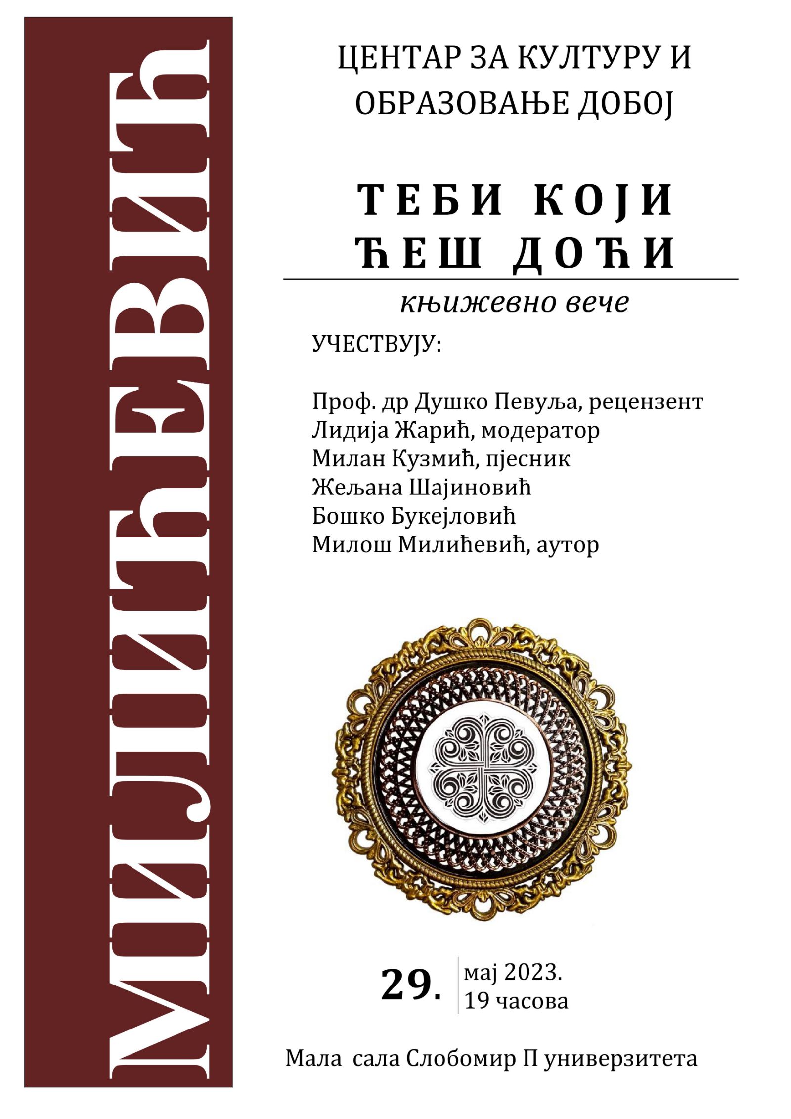 Centar za kulturu i obrazovanje Doboj najavljuje promociju knjige "Tebi koji ćeš doći" poznatog autora Miloša Milićevića. Ova izuzetna knjiga prozno-poetskih tekstova predstavlja rezultat Milićevićevog kreativnog iskustva i unutrašnje dubine.