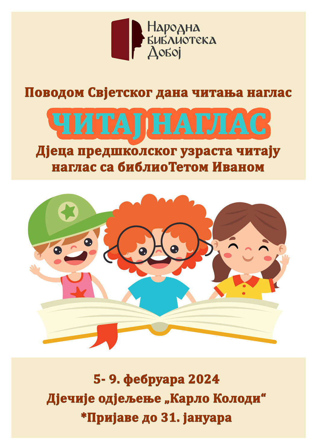 Povodom obilježavanja 7. februara, Svjetskog dana čitanja naglas, Narodna biblioteka Doboj organizuje posebne čitalačke sesije pod nazivom "Čitaj naglas" namenjene najmlađima. U okviru ovih sesija, koje će se održavati na dječjem odjeljenju biblioteke, učestvovaće predškolske grupe Javne predškolske ustanove "Majke Jugović" iz Doboja.