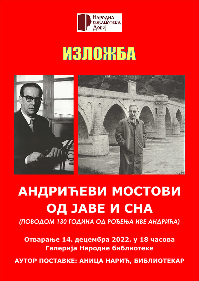 Narodna biblioteka Doboj upriličiće otvaranje izložbe pod nazivom „Andrićevi mostovi od jave i sna“, u srijedu, 14. decembra 2022. godine u 18 časova.