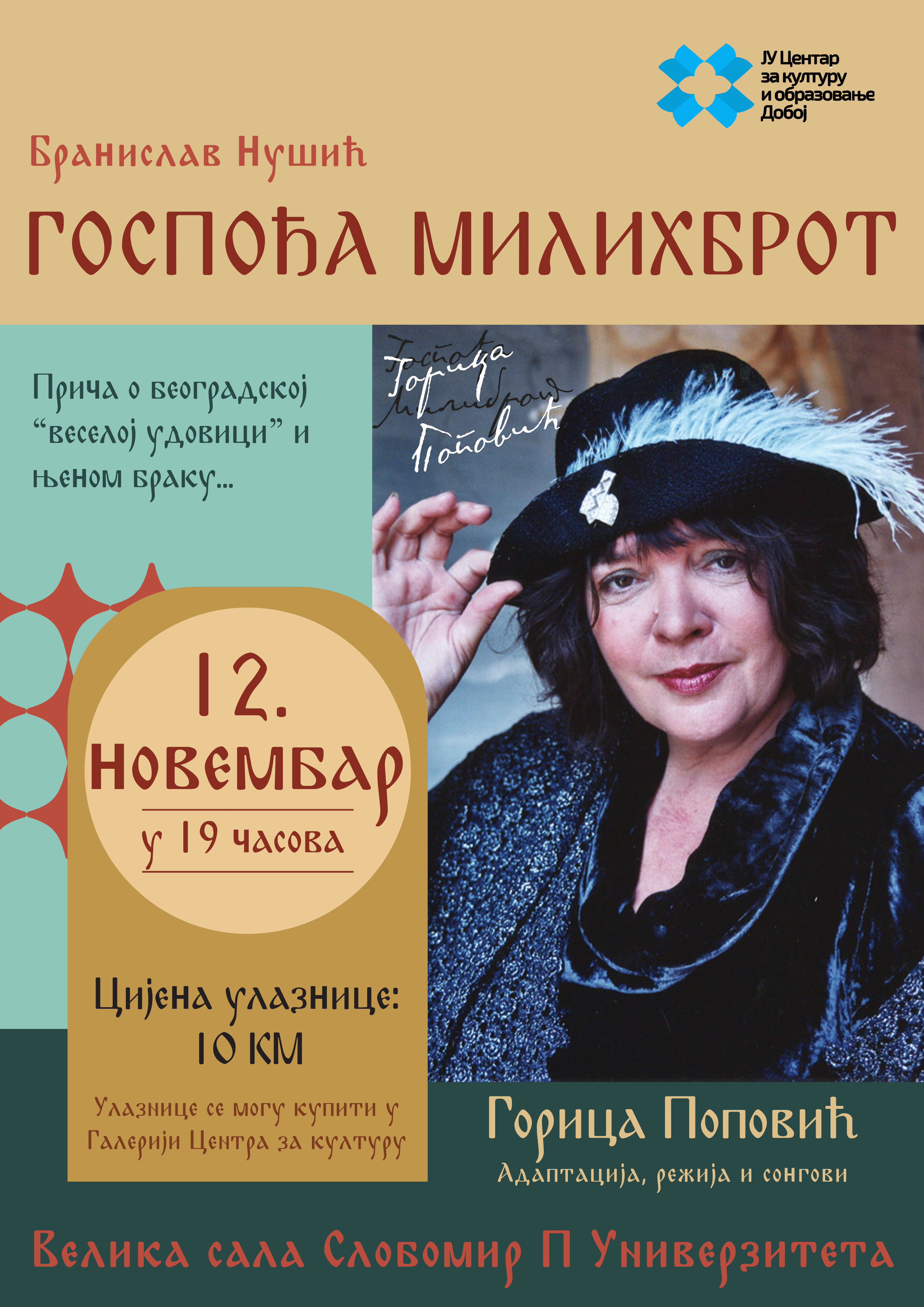 U utorak, 12. novembra, velika sala Pavlović univerziteta biće mjesto posebnog pozorišnog događaja. U izvođenju proslavljene glumice Gorice Popović, publika će imati priliku da prisustvuje monodrami «Gospođa Milihbrot», jedinstvenom spoju komedije i satiričnih prikaza svakodnevnog života. Predstava počinje u 19 časova, a organizator je Centar za kulturu i obrazovanje.