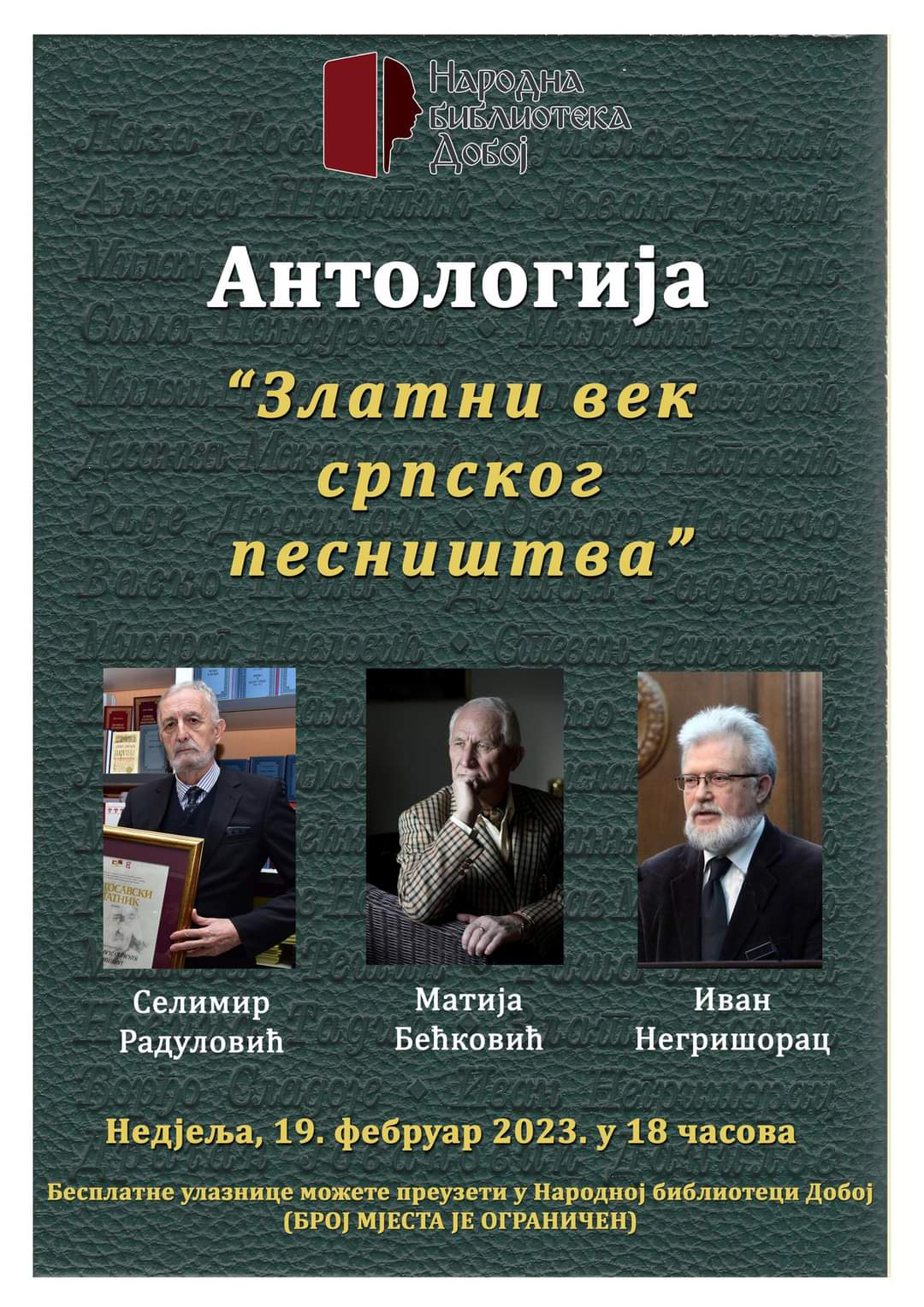 Narodna biblioteka u Doboju najavila je za nedjelju, 19. februar, promociju književne antologije "Zlatni vek srpskog pesništva" Selimira Radulovića, kada će, uz autora, kao gosti prisustvovati akademik Matija Bećković i pjesnik Dragan Stanić koji piše pod pseudonimom Ivan Negrišorac.