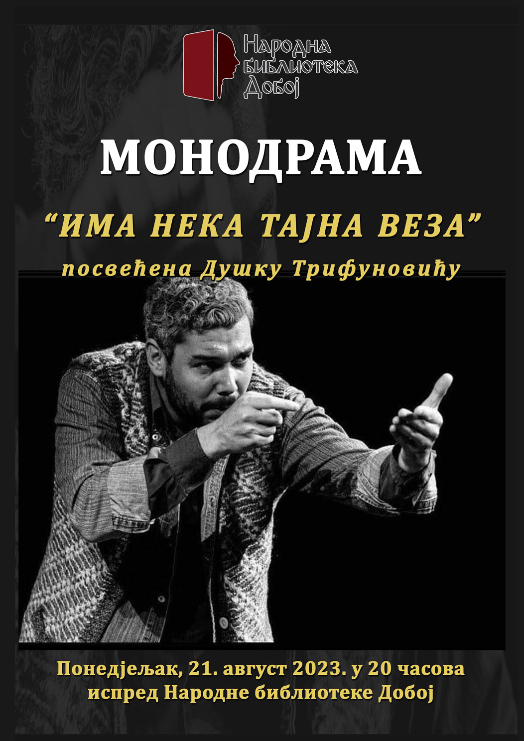 Monodrama "Ima neka tajna veza" obećava da će biti nezaboravno putovanje kroz poeziju, emocije i intelektualnu dubinu. Ovaj izvanredni kulturni događaj ne smijete propustiti. Vidimo se u ponedjeljak, 21. avgusta, u 20:00 časova ispred Narodne biblioteke Doboj, gdje će Milan Dimić oživjeti Duška Trifunovića kroz svoj zanosan nastup.