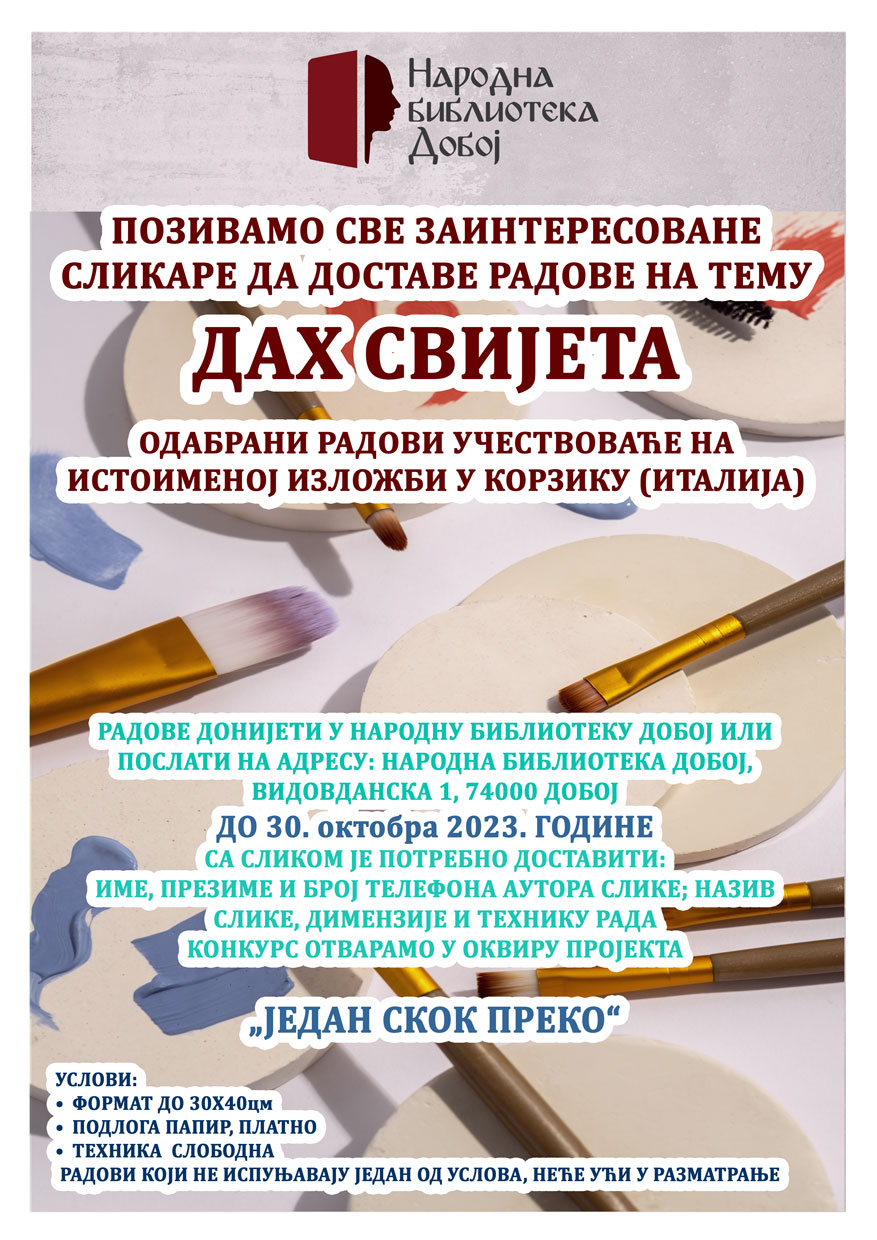Narodna biblioteka Doboj, u partnerstvu s poznatim Društvom slikara iz Italije „Cesare Frigerio“, organizuje izložbu pod nazivom „Dah svijeta“ i poziva sve zainteresovane slikare da dostave svoje radove.