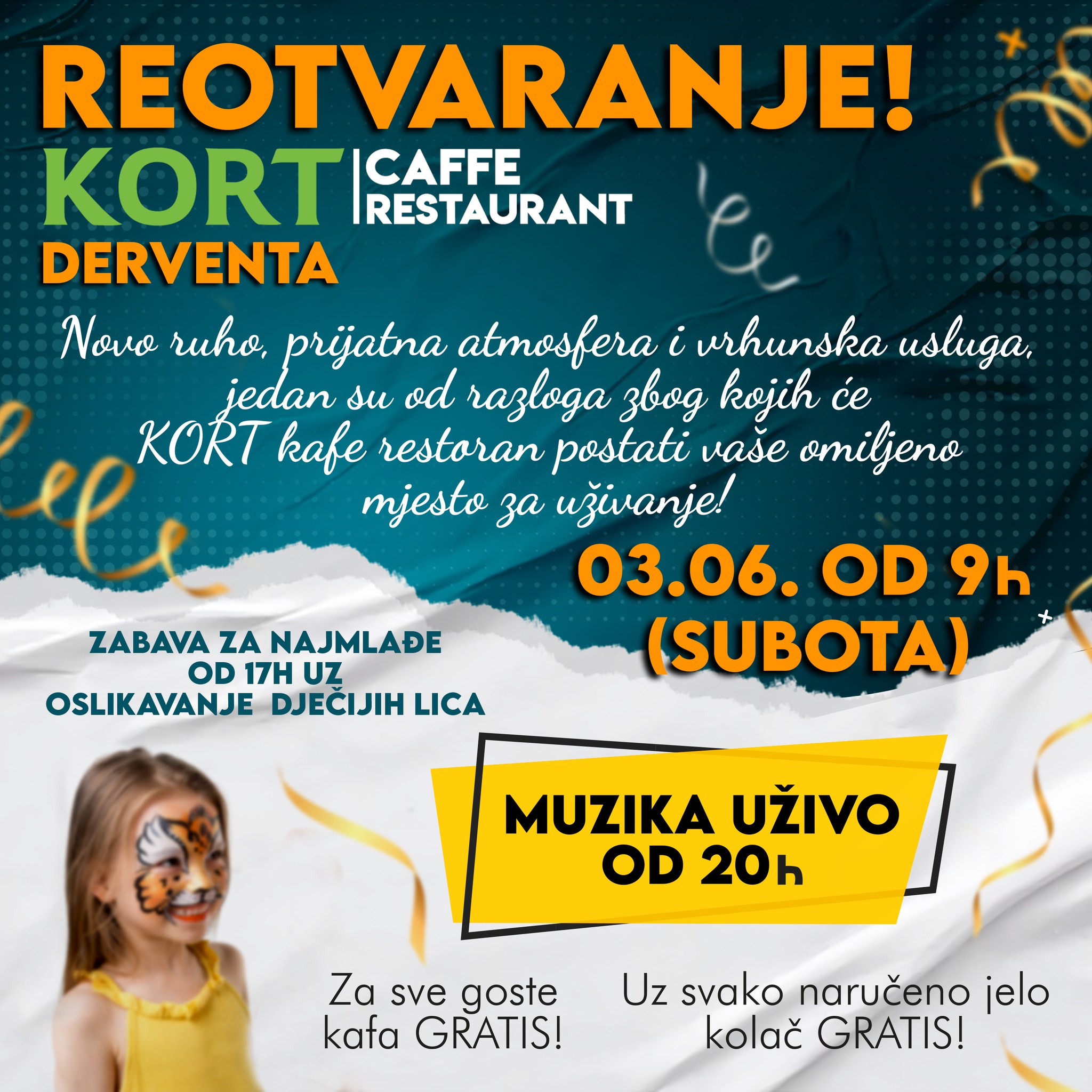 Kako bi proslavili ovaj poseban trenutak, KORT Kafe Restoran pripremio je brojne pogodnosti za sve posjetioce tokom cijelog dana. Svaki gost će dobiti besplatnu kafu i kolač kao dobrodošlicu. Osim toga, posebno za naše najmlađe posjetioce, organizovana je odlična zabava s dječijim programom koji započinje u 17 časova u novoj i proširenoj igraonici.
